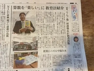 テーブルの上に広げられた新聞記事には、明るい表情で本を手にする田邊塾長が写っています。